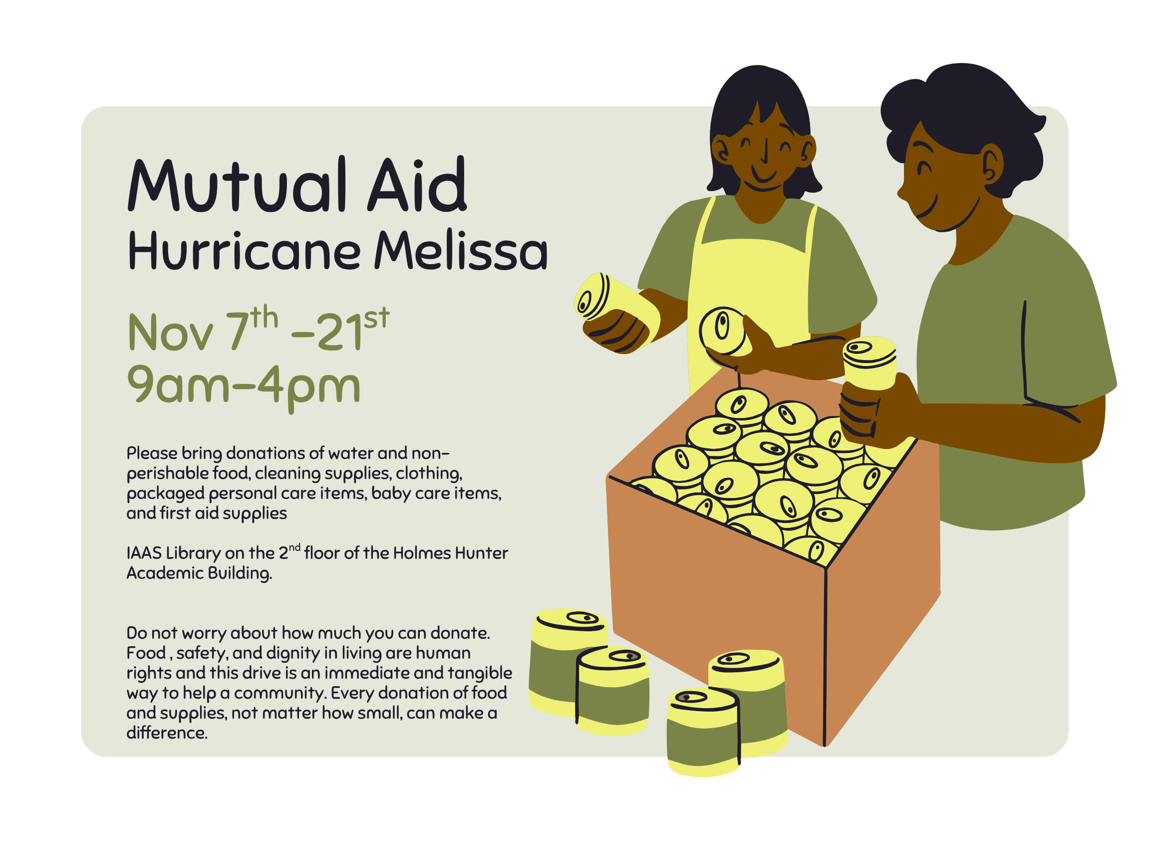 IAAS Library, Holmes Hunter 2nd Floor Friday, November 7 - Friday, November 21 2025, All day Friday, November 7 - Friday, November 21 2025, All day The Institute for African American Studies is partnering with local business Rashe's Cuisine a Jamaican and Soul Food fusion restaurant that is the catering vendor for all of IAAS events and ceremonies to assist the victims of Hurricane Melissa in Jamaica. Victims are experiencing infrastructure devastation and social service interruptions due to the impact and scale of the damage caused by the storm. Please join us in putting food and supplies in the hands of the people, doing so in the spirit of community and collaboration that undergirds all of our work and events in the IAAS community. Infographics and flyers are attached with details and instructions on how you can lend a hand to this relief effort. All items will be gathered in the IAAS Library, you can simply place packaged and non-perishables items on the table. Here is a word of integrity and hope from Ms. Rashe Malcolm owner and chef of Rashe's Cuisine: "This is a personal initiative, not linked to any organization or campaign. I know many of you are already contributing to larger relief efforts, but if anyone would like to support this small community effort — either for this Sunday trip or a follow-up run later — I’d really appreciate it. Donations aren’t limited to these — anything you can give is welcome. Even one or two items make a difference. I’ll document and distribute everything directly to families or through the school shelter, and I’ll share an update after the trip.Thank you all so much — I really just want to make sure no one back home feels forgotten in these first few weeks." In addition spread awareness of this donation drive to your peer and student networks. We hope people can participate widely across UGA's campus. Green Neon Yellow Food Drive Landscape Poster_2.png (360.86 KB) Departmental Host or Contact: Ashaé Burgess